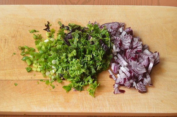 Добавить к овощам горячий булгур, лук и зелень, посолить и поперчить по вкусу, аккуратно перемешать.