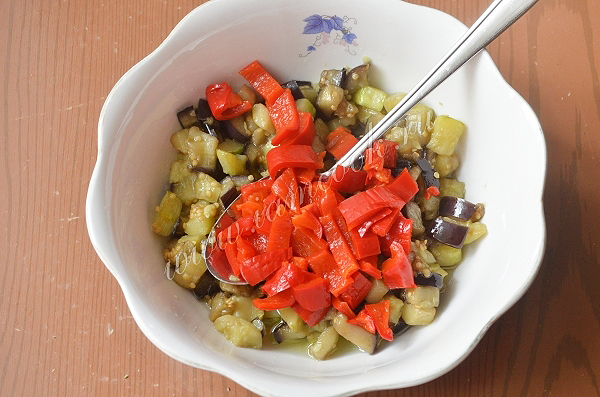 С готового болгарского перца снять кожуру, перец нарезать кубиками, перемешать с кабачком и баклажаном.