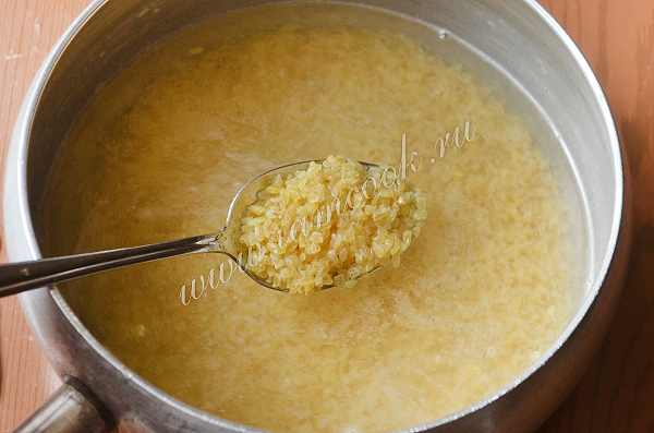 Булгур залить холодной водой, чтобы она была выше уровня крупы на 2 см., сварить до готовности.