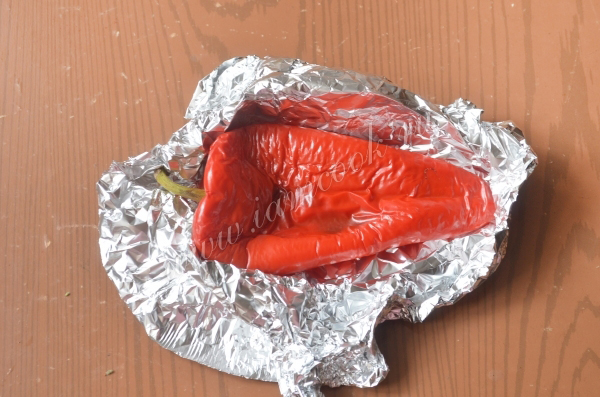 Сладкий перец необходимо запечь. Для этого его необходимо промыть, просушить, завернуть в фольгу и отправить в духовку при 200 С на 30 минут.