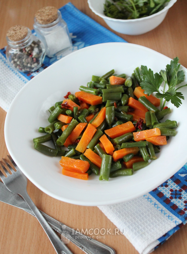 Морковь добавляем и для вкуса, и для красоты: ведь гораздо привлекательнее блюдо смотрится в таких ярких контрастных цветах, как зеленый и оранжевый! Нарезаем ее брусочками, по размеру и виду близкими к фасоли.
