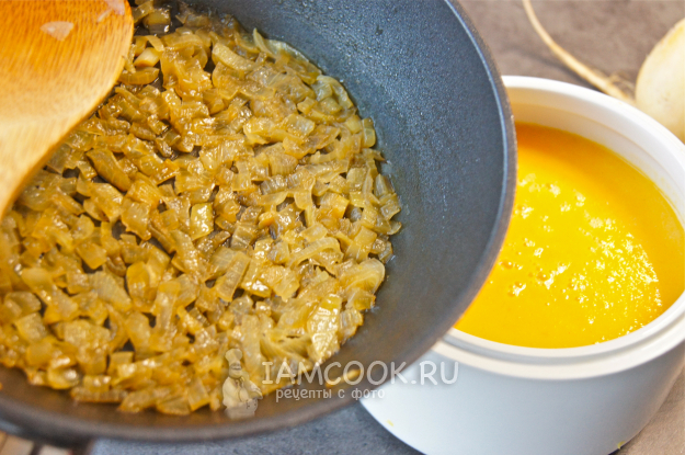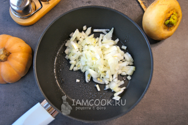 Пока варятся тыква с репой, очистите лук, мелко нарежьте и обжарьте на сковороде с растительным маслом до румяности.