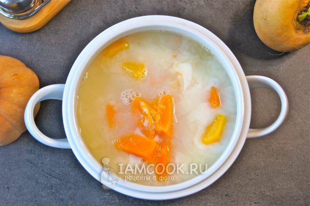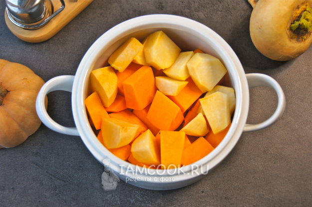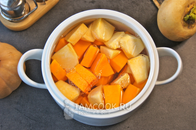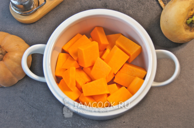 Очистите репу, нарежьте на средние куски и отправьте в кастрюлю к тыкве.