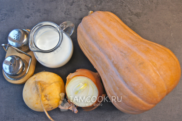 Итак, для начала подготовим все необходимые продукты для супа из тыквы и репы и приступим.