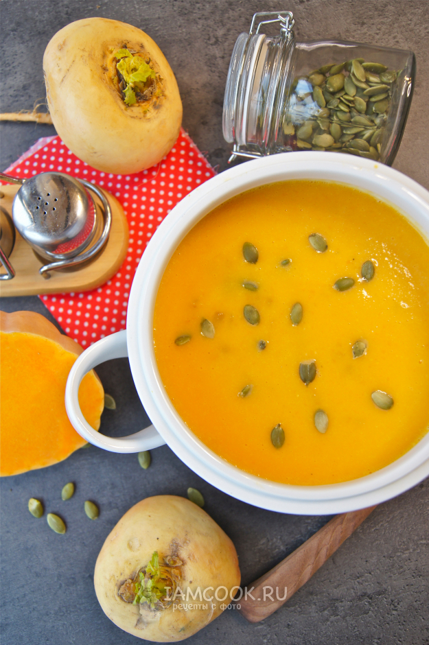 Вкусный, нежный, ароматный суп из тыквы и репы готов, подавать нужно в горячем или теплом виде, по желанию можно добавить тыквенные семечки.