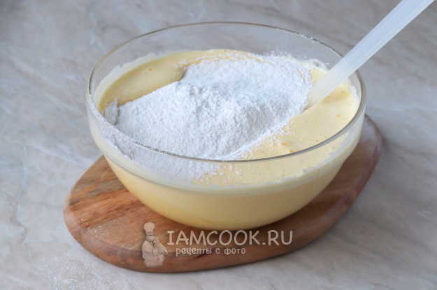 Затем введите просеянную пшеничную муку и разрыхлитель. Снова перемешайте.