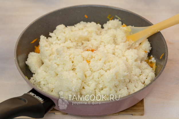 Капусту измельчите в кухонном комбайне и выложите в сковороду с обжаренными овощами. Добавьте воду и тушите до ее полного испарения.