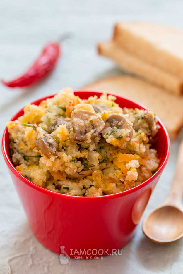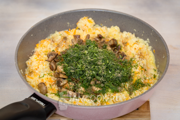 Добавьте грибы в сковороду с овощами, посолите и поперчите по вкусу.