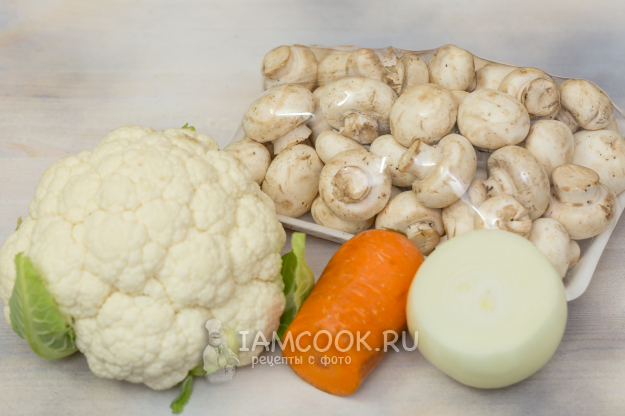 Подготовьте продукты для приготовления цветной капусты с грибами на сковороде.