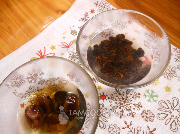 Промоем и переберём орехи, финики, изюм. Орехи, немного измельчив, обжарим на сухой сковороде. Сухофрукты зальём крутым кипятком на 10-15 минут.