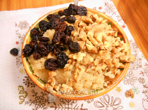 Финики нарезаем средним кубиком, добавляем к каше. Также не забудем добавить отжатый от воды изюм и подрумяненные орехи.