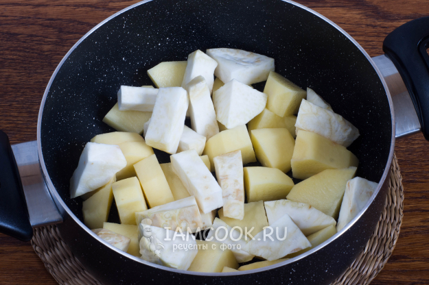 Картофель промойте, сельдерей почистите. Нарежьте овощи крупными кусочками. Залейте водой так, чтобы они были полностью покрыты. Доведите до кипения и варите примерно 20 минут - до полной готовности картофеля и сельдерея.