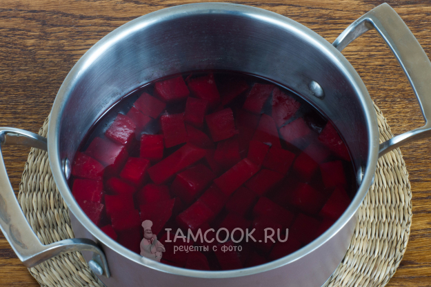Залейте водой так, чтобы свекла была полностью покрыта. Доведите до кипения, добавьте столовый уксус и на минимальном огне готовьте около 2 часов.