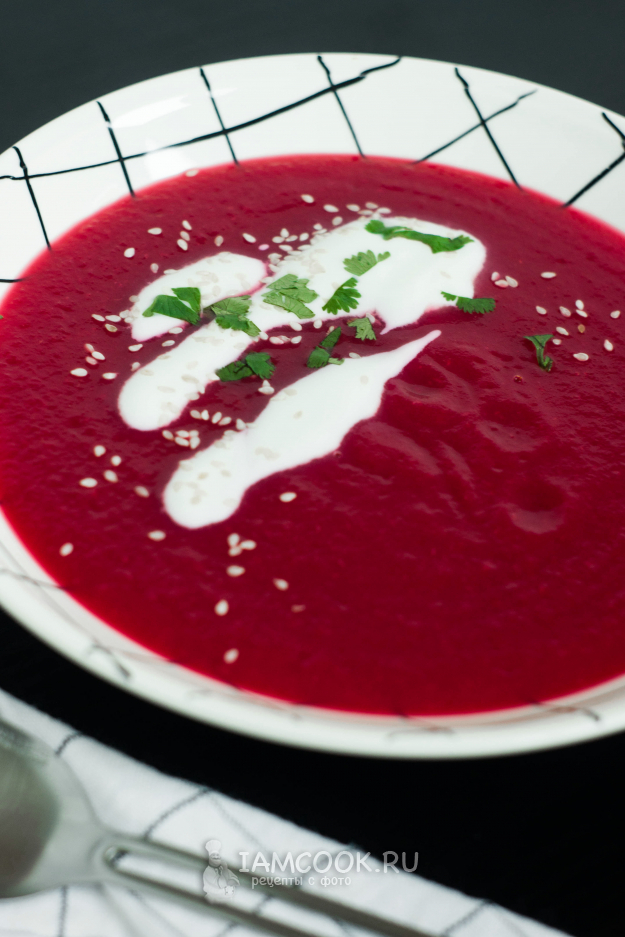 На стол суп-пюре из свёклы подавайте горяченьким! Добавьте в каждую тарелку немного сметаны или йогурта, украсьте зеленью, кунжутом...