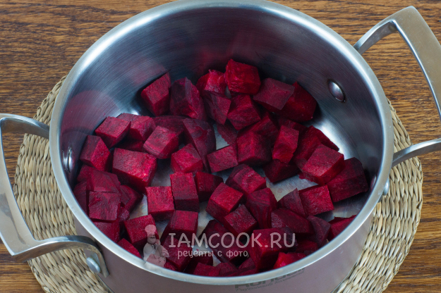 Свеклу промойте, почистите и нарежьте кубиками среднего размера.