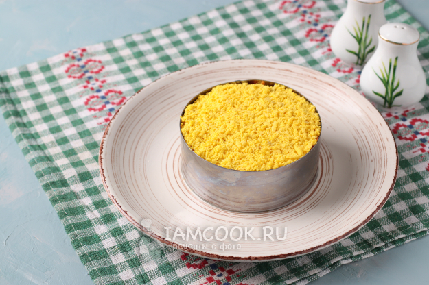 Натереть желтки и посыпать ими верх салата.