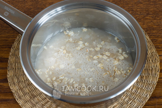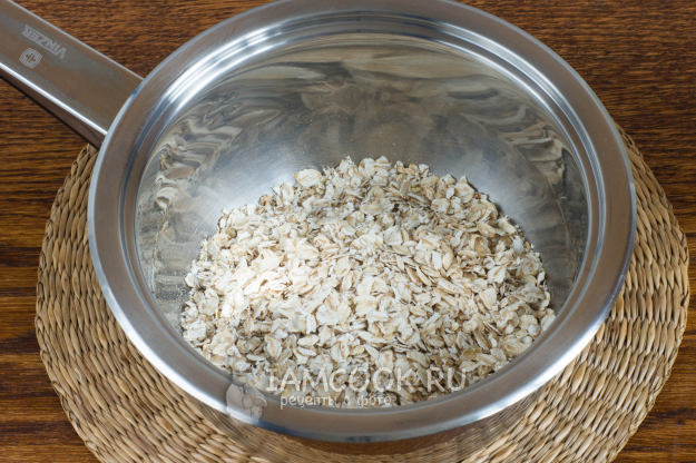 В кастрюлю или сотейник с толстым дном положите овсяные хлопья.