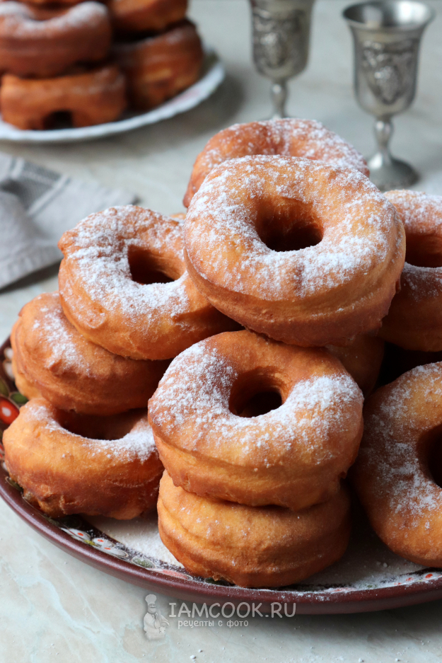 Жарьте пончики на умеренном огне по 1,5-2 минуты с каждой стороны, до красивого золотистого цвета. Затем аккуратно с помощью шумовки переложите их на тарелку, застеленную бумажным полотенцем. После остывания посыпьте сахарной пудрой.