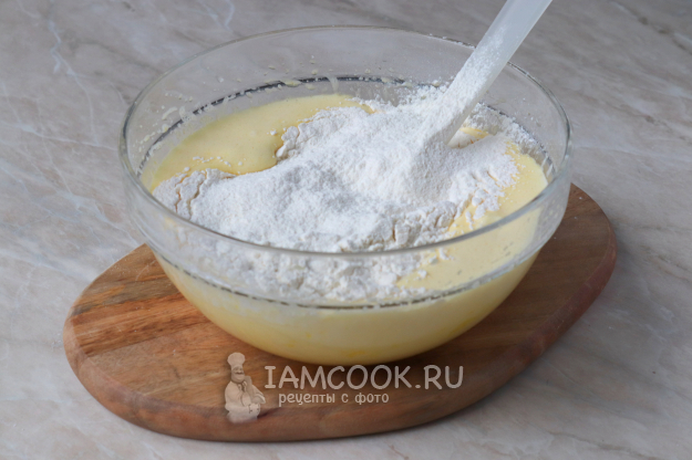По истечению времени введите просеянную пшеничную муку. Её количество может немного отличаться от указанного в списке продуктов, в зависимости от сорта и торговой марки, поэтому лучше добавляйте частями.