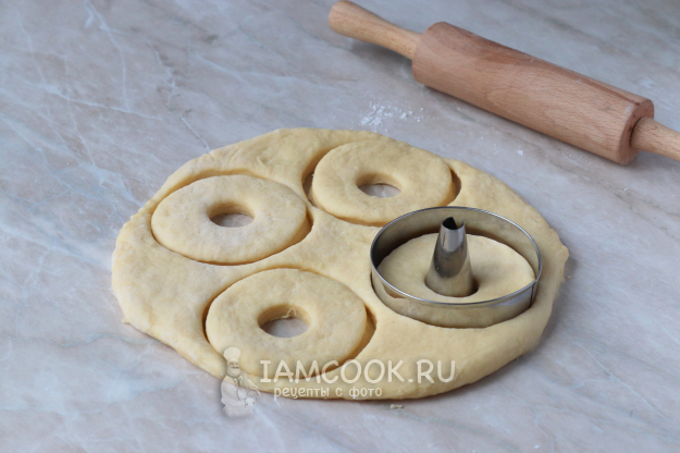С помощью тонкого стакана или металлической вырубки, вырежьте из теста круглые заготовки желаемого диаметра. По центру каждой лепёшки сделайте небольшое отверстие (как на фото). Я для этих целей использую насадку для кондитерского мешка. Таким образом переработайте всё тесто.