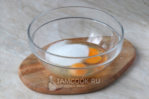Куриные яйца соедините с сахарным песком и с помощью миксера взбейте до пышного состояния.