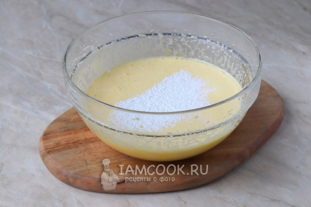 Затем добавьте ряженку и разрыхлитель. Перемешайте и оставьте получившуюся массу на 10 минут при комнатной температуре.