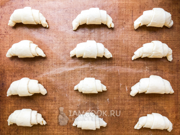Выложите рогалики на противень, застеленный пергаментной бумагой. Выпекайте в разогретой до 180 градусов духовке 30 минут.