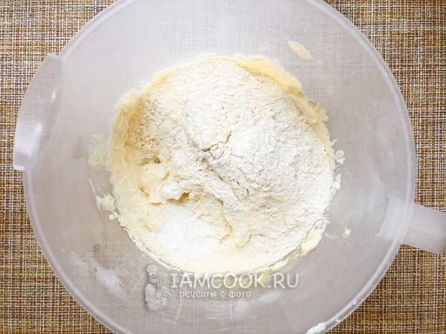 Добавьте муку и разрыхлитель. Замесите однородное тесто, лопаткой или рукой. Уберите в холодильник на 10 минут.