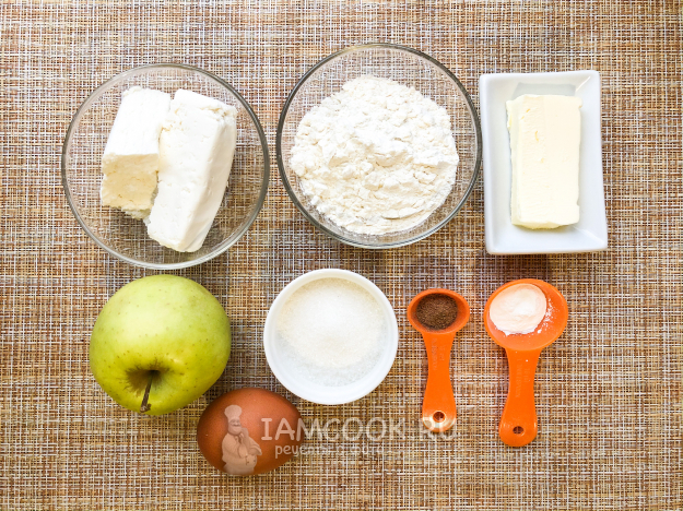 Для приготовления творожных рогаликов с яблочной начинкой возьмите следующие ингредиенты.