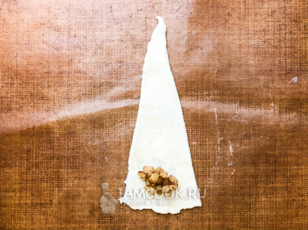 Далее каждый треугольник раскатайте скалкой еще раз, чтобы он вытянулся. Выложите на широкую часть немного яблока и аккуратно закрутите в рогалик.