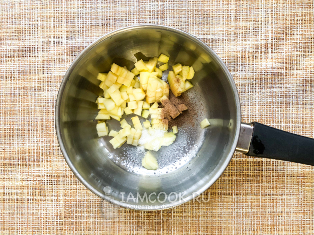 Яблоко очистите и нарежьте на маленькие кубики. В сотейнике соедините яблоко, сахар и корицу. Прогрейте на маленьком огне, постоянно помешивая, в течение 2 минут.