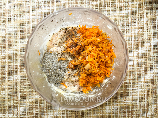 Добавьте отруби, обжаренные овощи, соль и перец. Тщательно перемешайте.