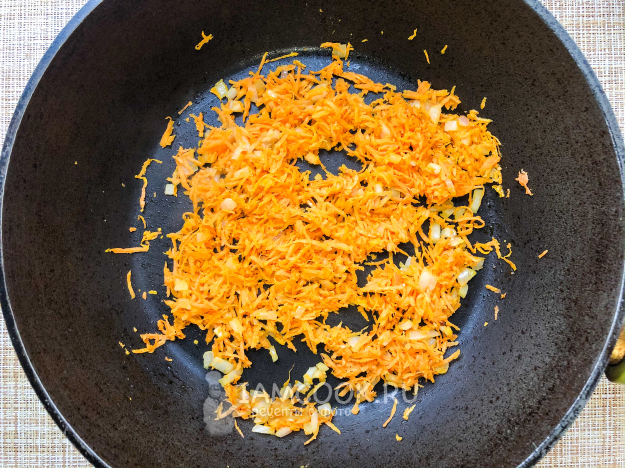 Очистите лук и морковь. Лук мелко нарежьте, а морковь натрите на мелкой терке. Обжарьте на подсолнечном масле на сковороде в течение 5 минут.