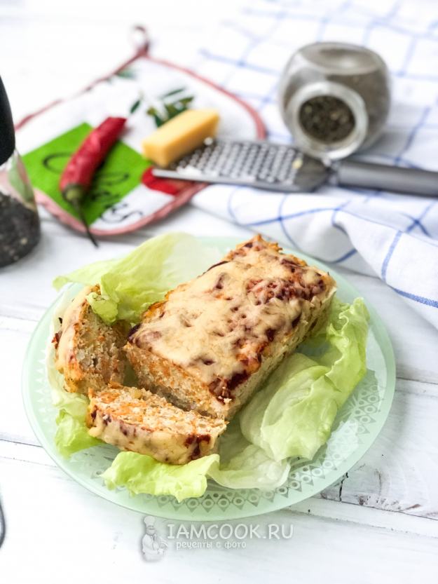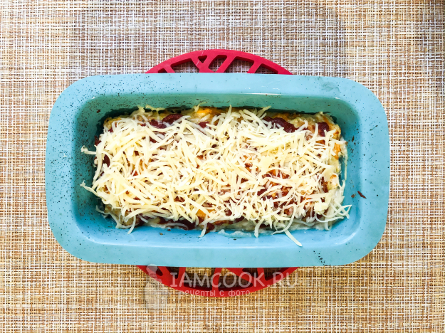 Через 30 минут смажьте сверху запеканку томатным соусом и посыпьте тертым сыром. Готовьте еще 10 минут.