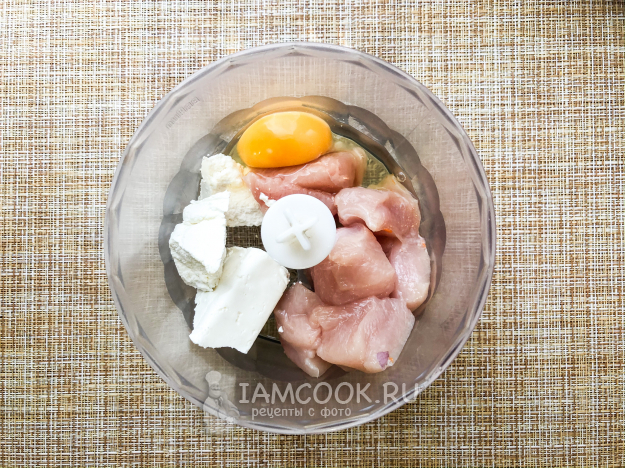 Куриное филе нарежьте на средние кусочки. Соедините его в блендере вместе с творогом и яйцом. Измельчите, но не в кашу, можете оставить крупные кусочки курицы.