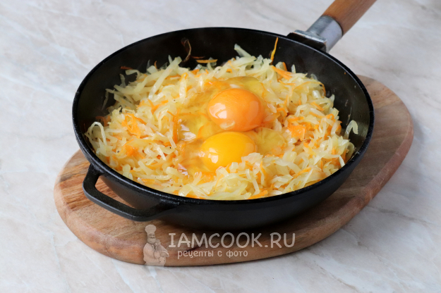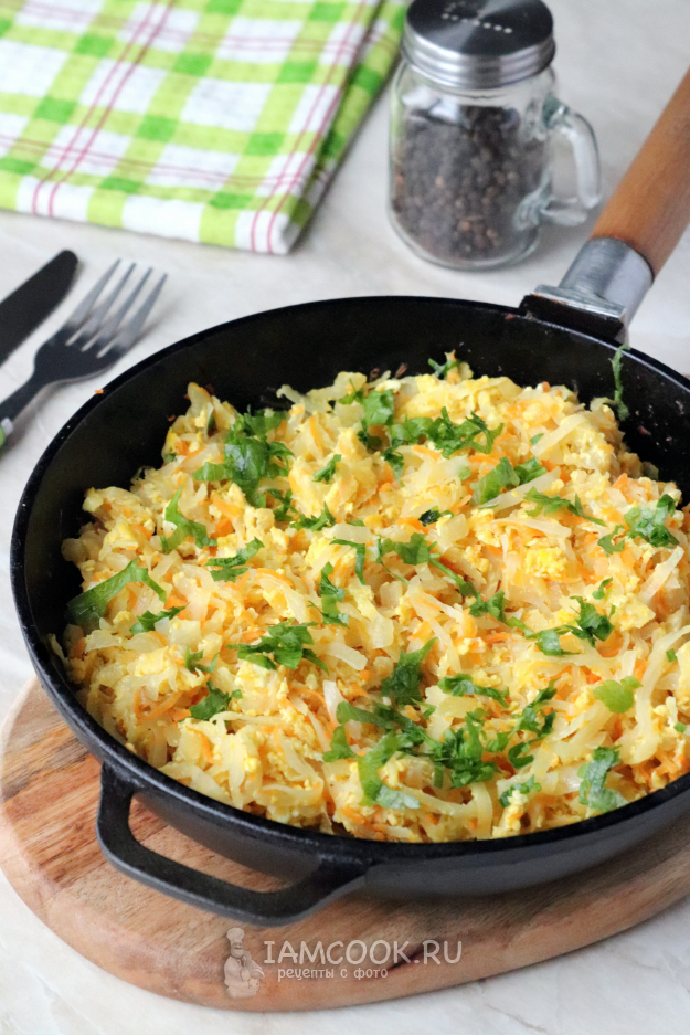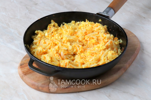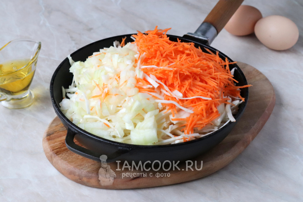 Капусту очистите от верхних повреждённых листочков и нашинкуйте тонкими длинными полосками. Очищенный лук нарежьте кубиками, а морковь натрите на терке со средними ячейками. Подготовленные овощи соедините и выложите на разогретую с растительным маслом сковороду.