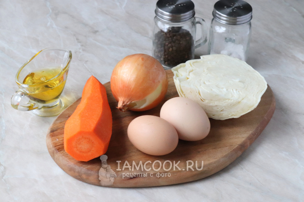 Для приготовления тушеной капусты с яйцом на сковороде подготовьте продукты по списку к рецепту.