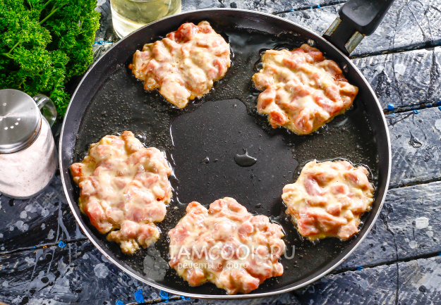 После чего извлеките и прогрейте около 10-15 минут при комнатной температуре. Влейте на сковороду растительное масло без запаха, прогрейте сковороду на умеренном нагреве до кипения масла. Выложите столовой ложкой порции мясной массы в масло и обжарьте с одной стороны около 2 минут.