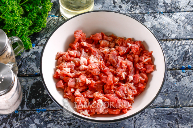 Говядину промойте в воде, нарежьте мелкими кусочками и выложите нарезку в глубокую емкость. Если в мякоти попадаются кусочки сала, то не вырезайте их - с ними блюдо получится более сочным.