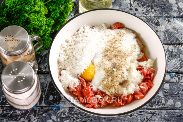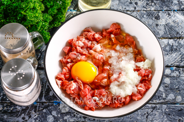 Вбейте в емкость куриное яйцо. Очистите репчатый лук и чеснок, промойте. Натрите на терке для создания пюре (на такой терке зубцы обращены не внутрь девайса, а наружу. Процесс слезообильный, но необходимый.