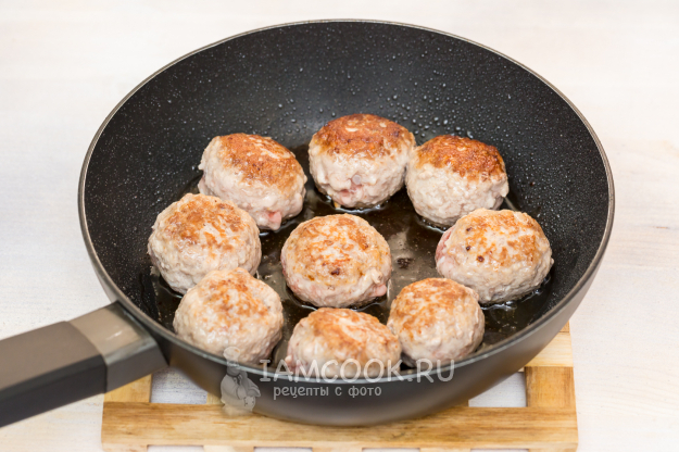 Фарш посолите и поперчите, сформируйте из него фрикадельки и обжарьте до полуготовности с двух сторон до румяной корочки.