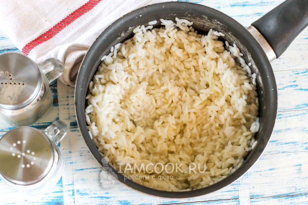 Рис промойте в воде, высыпьте его в кастрюлю или казан. Залейте кипятком, всыпьте в емкость соль и отварите на умеренном нагреве крупу до готовности. На это уйдет около 10-15 минут. Точное время приготовления риса вы можете прочитать на упаковке. Затем выключите нагрев, накройте емкость крышкой и оставьте крупу для пропаривания на 5 минут. За это время рис впитает в себя оставшуюся в емкости жидкость.