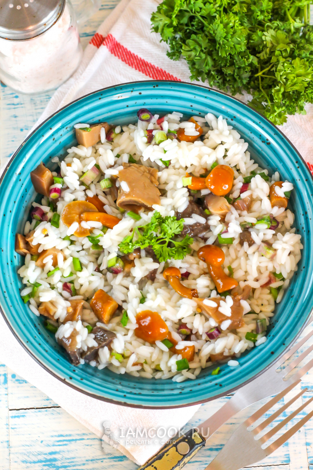 К столу салат с рисом и грибами подайте сразу же после его создания.