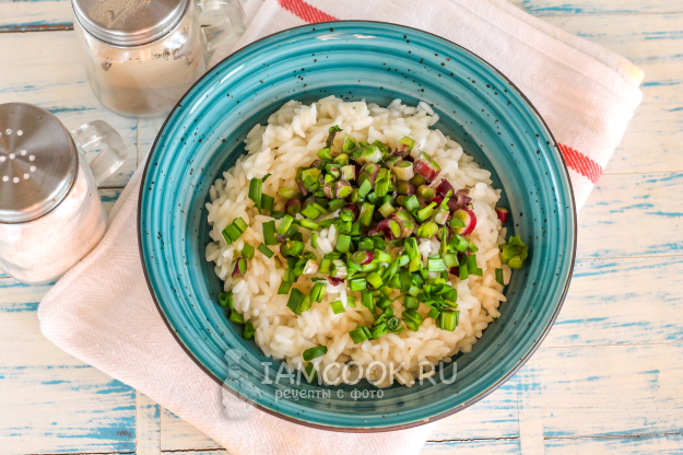 Выложите горячий рис в тарелку или предварительно его остудите перед этим. Промойте зеленый лук и измельчите, добавьте в емкость к отварному рису. На этом этапе возможно добавление и другой измельченной зелени.
