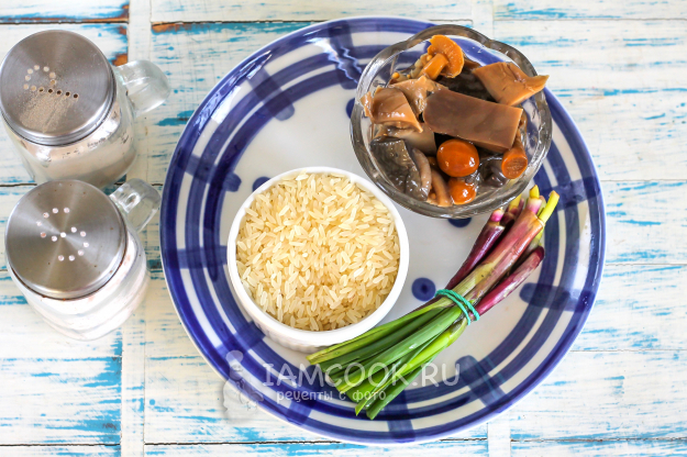 Подготовьте необходимые ингредиенты для салата с грибами и рисом и начнем кулинарить!