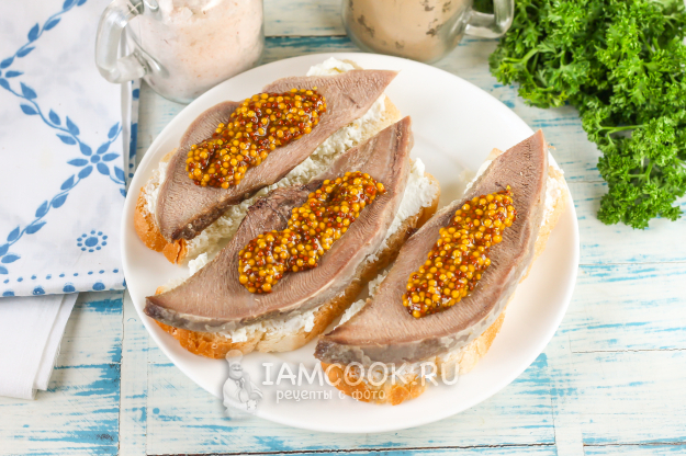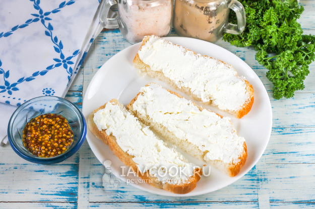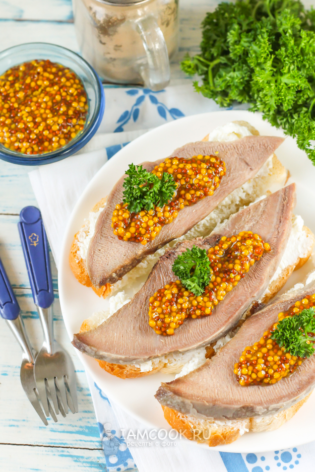 Хлебные ломтики разрежьте пополам: горизонтально, вертикально или по диагонали - как вам нравится. Обмажьте их сверху творожным сыром и посолите. Можно и поперчить, но помните, что сверху ломтей отварного языка будет зерновая горчица!