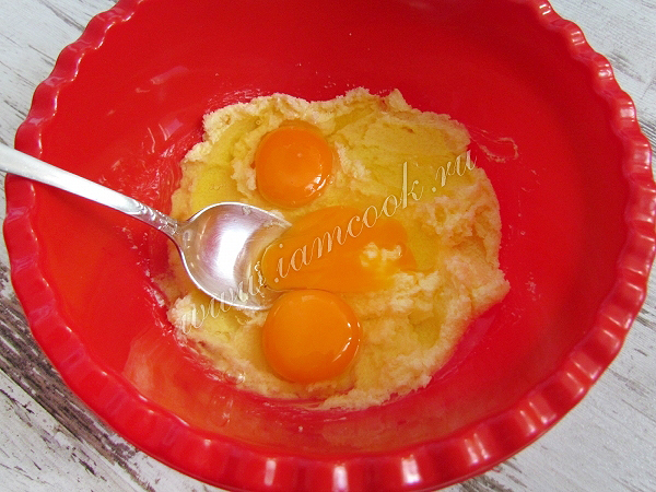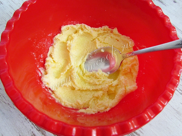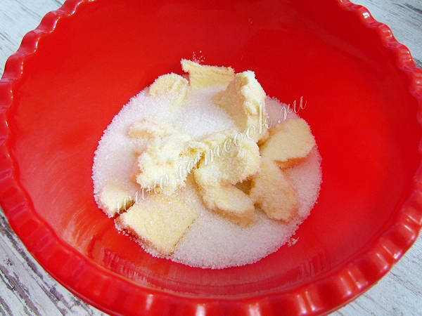 В отдельной миске соедините размягченное сливочное масло, сахар и ванильный сахар.