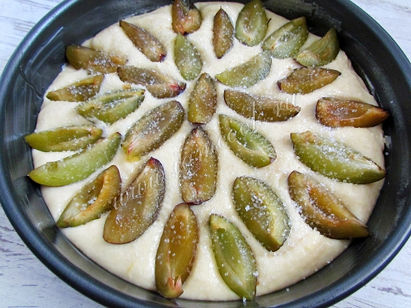 Выложите сливы на тесто и присыпьте 1 ст.л. сахара.