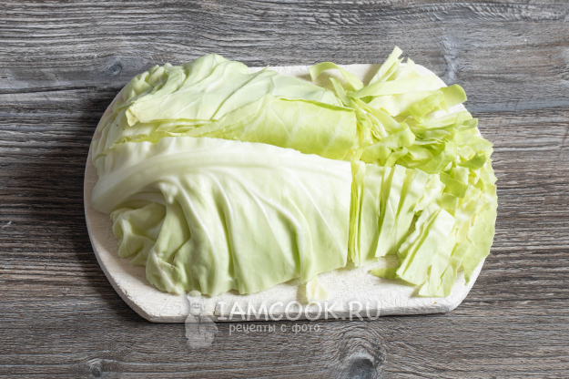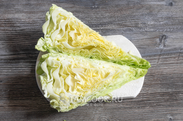 Кочан капусты разрезаем на четверти и удаляем сердцевину. Кстати, оптимальная капуста для приготовления с бараниной в духовке - всё-таки именно такая, остроконечная, с тонким листом.