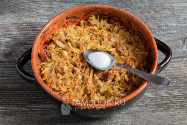 Оставляем посоленную баранину с капустой под крышкой в выключенной духовке ещё на полчаса. После этого она должна стать очень мягкой и плавать в большом количестве мясного сока.